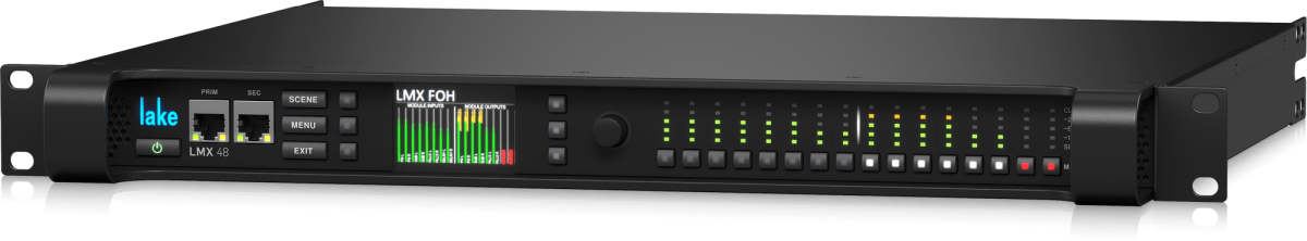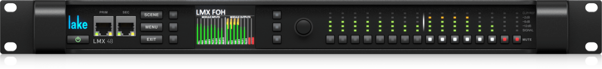 LMX 48 provides the ultimate combination of input/output signal flexibility and fail-safe operation. Audio inputs are accepted via the Dante network and AES50 as well as on connectors for AES3 digital and analog.Simple programming in Lake Controller allows multiple, user-configured “Scene” presets to be stored (input scenarios). In addition, as with all Lake Dual Redundant products Dante Audio switch seamless between Primary and Secondary, and Control can also be used on either Primary or Secondary interface.LMX 48 provides a total of sixteen input routers which can be independently configured with up to four input fail-over priority settings. And the output of any of these input routers can go to any of the Modules via the Module Input Mixer, also be patched directly to any analog, AES3, Dante/AES67 or AES50 output – without using any of the valuable Module processing channels.