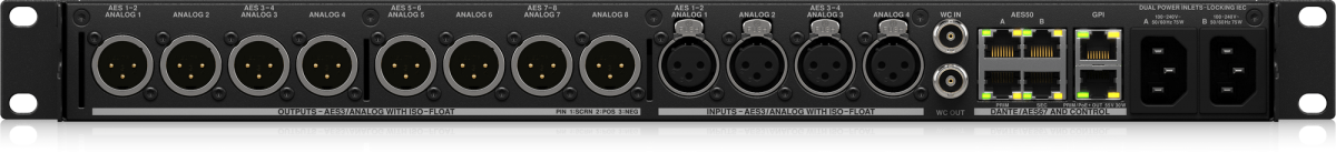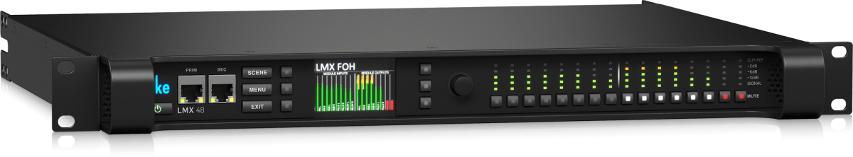 The LMX 48 provides an 4 x 8 analog I/O, 4 × 8 AES3 digital I/O, 8 × 8 Dante networked I/O and two interfaces of AES50 where up to 24 channels from the up to 96 AES50 channels can be selected and used as inputs or outputs – this makes the signal routing very flexible. The 16 input routers have four fully programmable priorities for redundant input operation and provide seamless failover between the inputs.