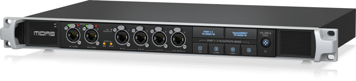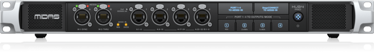 HUB4 PRO can supply up to four DP48 personal monitor mixers with PoE (Power over Ethernet) and 48 channels of 24-bit/48 kHz audio or 2x 24 channels at 96 kHz. HUB4 PRO also collects 48 channels of upstream audio and forwards this audio to the FOH console, either from stage boxes connected to the AES50-B (THRU) Port or 8 return channels from each of Ports 1-4.Cascading Hubs for Large Setups