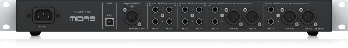 To meet the challenges of large monitoring setups, HUB4 PRO can easily be daisy-chained to make additional DP48 ports available, all the way up to symphonic orchestra applications.On the other hand, HUB4 PRO can also address situations where you want to connect additional I/O via the same AES50 link to the mixing console. To help build out this AES50 console link, digital stage boxes such as the Midas DL16 or DL32 can be connected to the HUB4’s AES50 (THRU) Port. The console can pass downstream signals to their respective stage outputs, while also receiving 48 channels upstream from the stage inputs via HUB4 PRO