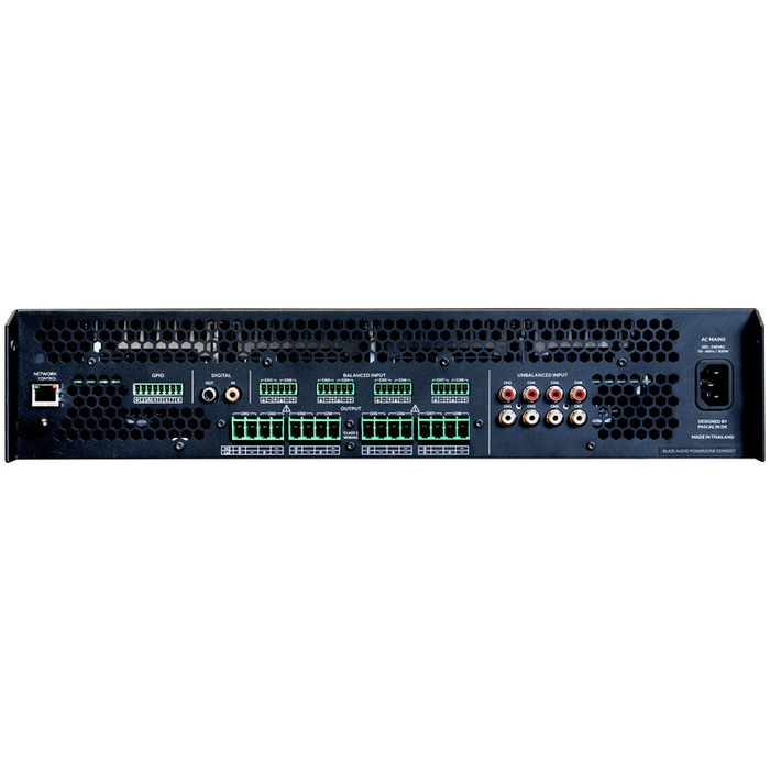 This versatile amplifier supports both conventional low impedance (4Ω to 16Ω) and constant voltage (70V/100V) transformer-coupled loudspeakers. Featuring four analog inputs and one stereo digital input, it offers flexible output options—8 x 750W in Lo-Z mode and 4 x 1500W in Hi-Z mode. Automatic power sharing technology ensures proportional distribution of 1500W among each pair of Lo-Z outputs.
