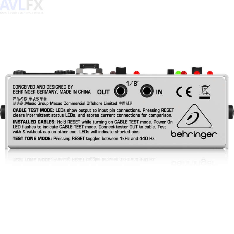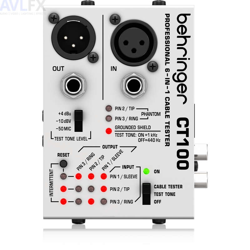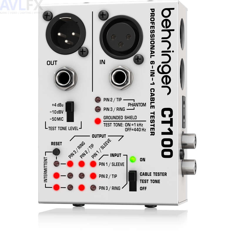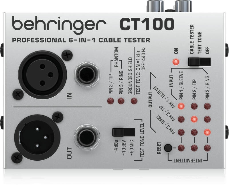 The Behringer CT-100 is a microprocessor-controlled cable tester for use with 3-Pin XLR, mono and TRS 1/4", mono and TRS 1/8", TT, RCA, and MIDI connectors. Test modes include continuity, intermittent, phantom power, grounded shield detect, and test tones. Operational power is supplied by two (2) AA alkaline cells (not included).