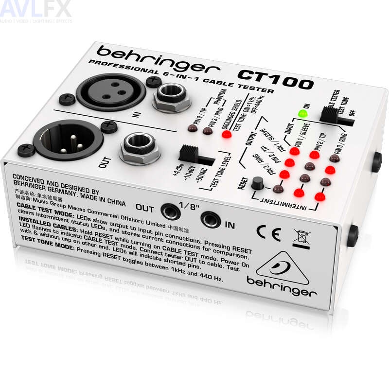 Behringer CT-100 Cable Tester Specs Connectors 3-Pin XLR, Mono and TRS 1/4", Mono and TRS 1/8", TT, RCA, and MIDI Test Modes Phantom power, Grounded shield detect, Tone, Continuity, and Intermittent Batteries 2 AA alkaline cells