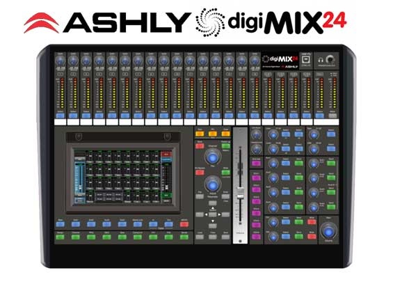The digiMix24 from Ashly comes in a light and compact chassis and is designed as a versatile and user-friendly 24-channel digital console, ideal for mixing live sound in worship and educational facilities, and for recording in project studios.The unit combines the feel of traditional analog mixers with the convenience and flexibility of a recallable digital mixer. The live-control surface features real knobs, a motorized 100mm fader which can be assigned to any individual channel, and an Intelligent Meter Bridge that displays signal levels and fader positions. Use the 7" color-LCD touchscreen to navigate sub menus and toggle various settings quickly and intuitively.