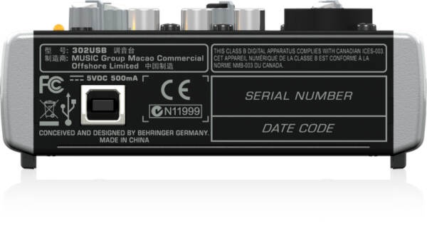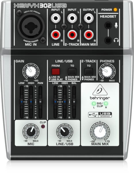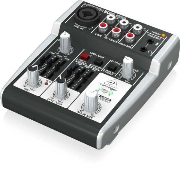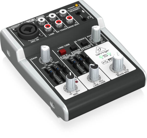 • The XENYX 302USB 5-Input Compact Mixer with USB delivers high-quality audio and excellent versatility in an ultra-compact design, ideal for home, project, or mobile studios. The mixer has an XLR/TRS combo mic input and a 3.5mm mic input, as well as a stereo RCA line input and a stereo 2-track RCA input. There is a stereo RCA main mix output, and a 3.5mm headphone jack for convenient monitoring. The stereo USB audio interface allows you to connect the mixer directly to a computer.