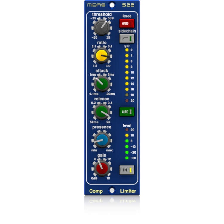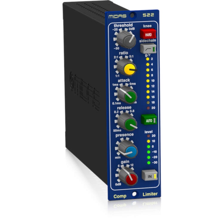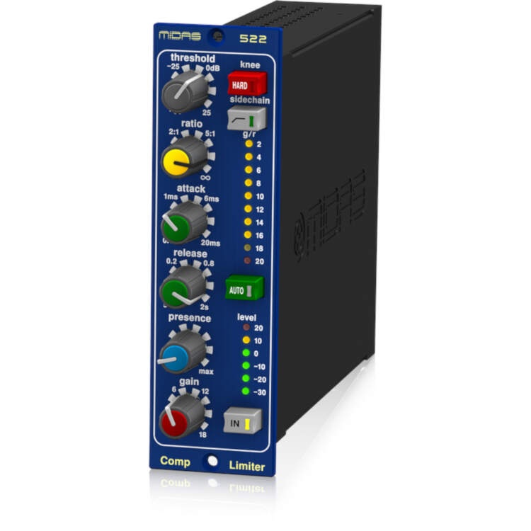 The COMPRESSOR LIMITER 522 brings state of the industry dynamics control to a compact 500 Series format processor that is good enough to wear the MIDAS name. When used in conjunction with the LEGEND L10, L6, or other standard 500 Series rackmount chassis, the 522 provides the ideal solution for users seeking the legendary MIDAS sound in a modular format that boasts upgraded, premium-quality performance. Additionally, the 522’s dynamic Presence control enables operators to add “air” to vocals without the unwanted noise or pumping effects found in competing products – and reduces the risk of feedback occurrence during live performance.