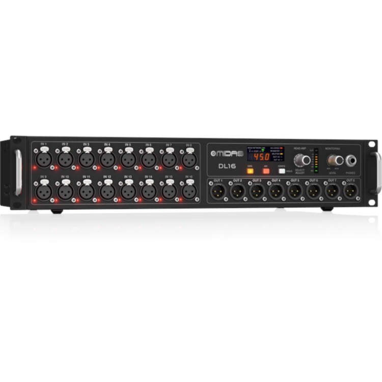Digital mixing has revolutionized virtually everything in the live entertainment production work flow, and now that same cutting-edge technology brings live production signal distribution into the modern age. The DL16 Stage Box provides 16 of our award-winning microphone preamplifiers with switchable +48 V phantom power; 8 balanced analogue XLR returns at the stage end; an integrated ULTRANET output for connecting to BEHRINGER P16-M personal monitor mixers; plus connectivity for your ADAT-compatible outboard equipment.If your application calls for more inputs, or just want to keep your cable runs short and tidy, putting a DL16 at stage front and another behind the drum riser provides an additional 16 inputs for drum and guitar/bass amp mic’ing. The best part – all it takes is a single CAT5 cable per stage box.