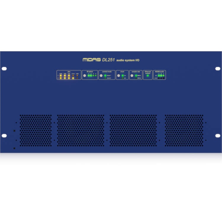 DL251 is a 5U 19" fixed-configuration rack I/O unit with 48 mic/line level inputs and 16 line level outputs and delivers legendary MIDAS sound quality utilising our time-tested and road-proven technologies. Featuring award-winning MIDAS microphone preamplifiers with 2.5 dB analogue gain steps and three AES50 network ports providing N+1 redundancy, plus an Ethernet control port and a MIDI Interface (In, Out, Thru), the DL251 is the ideal partner to the MIDAS M Series and PRO Series digital consoles, enabling a digital snake connection from Front of House to stage.