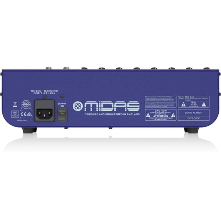 The audio mixing console shall be an analogue design suitable for use in live performance and studio recording, and equipped with 12 MIDAS microphone preamplifiers.The mixing console shall have 8 mono channels, and each shall provide the following: 1 balanced XLR microphone input, 1 balanced ¼ " TRS line level input, and a ¼ " TRS Insert. A gain control shall provide adjustment of the input signal from 10 to 60 dB (mic) and -10 to +40 dB (line). An EQ treble control shall provide a range of 15 dB of boost and cut of shelving EQ at 12 kHz. An EQ mid control shall provide a range of 15 dB of boost and cut, and a mid-sweep control shall provide peak EQ adjustment from 150 Hz to 3.5 kHz. An EQ bass control shall provide a range of 15 dB of boost and cut of shelving EQ at 80 Hz. Aux 1 and Aux 2 controls shall provide adjustment of the Auxiliary 1 and 2 outputs from 0 to +10 dB. A pan control shall position the mono channel in the mix. A PFL (pre fader listen) switch shall allow the channel signal to be soloed and routed to the master meters, monitors, and headphones. A mute switch shall be provided to mute the channel, and a peak LED shall indicate channel signal overloading. A 60 mm mono channel fader shall allow adjustment of the channel level in the mix.