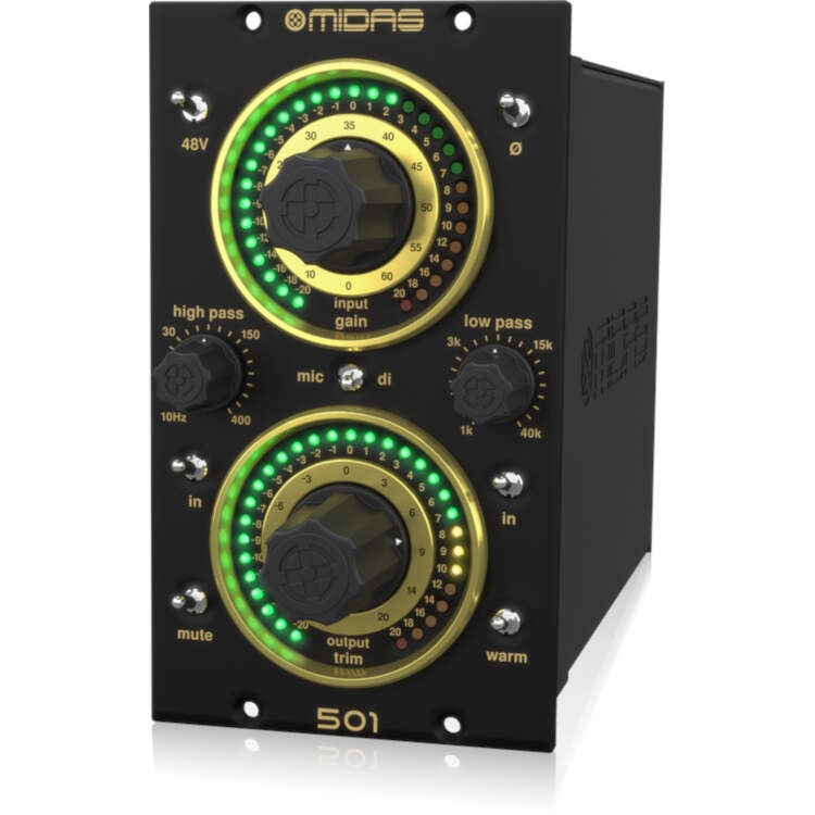 The Midas 501 module shall provide a single channel mic/line/DI preamplifier with dual inputs and dual outputs in a standard format 500 series double width module.The 501 module shall provide a 12 position rotary gain switch with mic/line input gain settings of 0, +10, +15, +20, +25, +30, +35, +40, +45, +50, +55, +60 dB. The maximum input gain shall be limited to +40 dB when the separate DI input is selected.