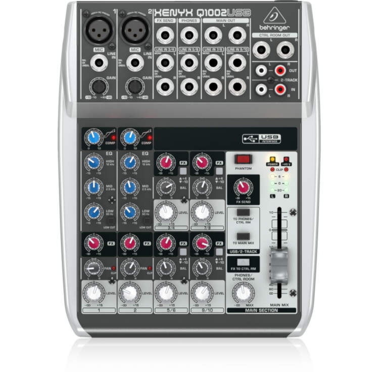The 10-input, 2-bus XENYX Q1002USB can accommodate either a dynamic or condenser microphone, thanks to available Phantom Power. The 3-band British EQ is famous for its warm, musical sound. Play music between sets via the 2-Track Inputs (main mix or control room/phones assignable) and record your performance to an outboard recording device via the RCA outputs.