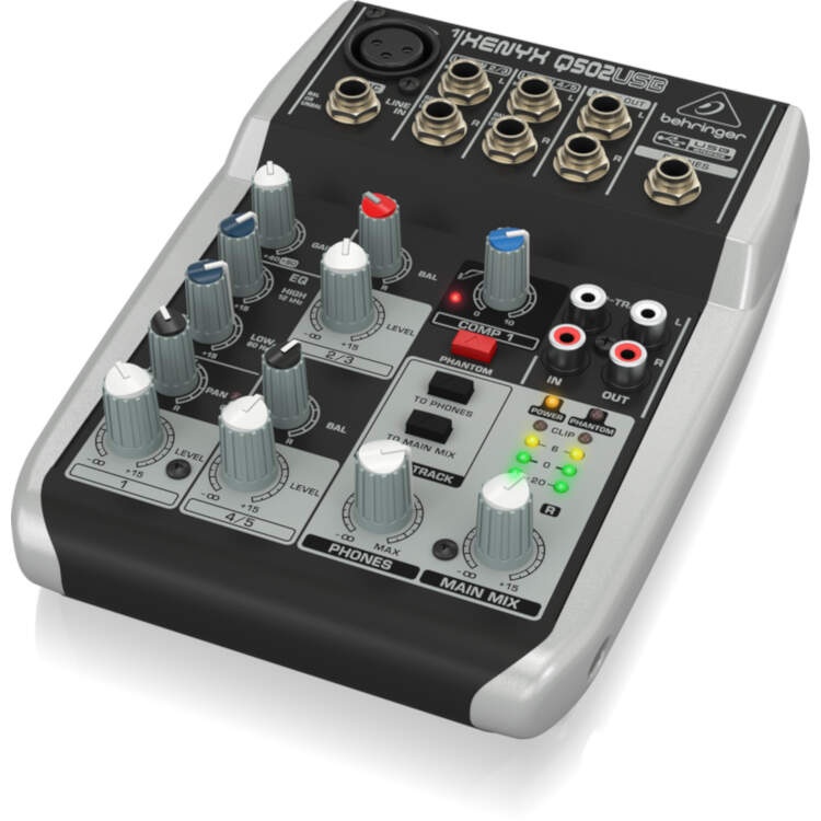 The 5-input, 2-bus XENYX Q502USB can accommodate either a dynamic or condenser microphone. The 2-band British EQ is famous for its warm, musical sound. Play music between sets via the 2-Track Inputs (main mix or control room/phones assignable) and record your performance to an outboard recording device via the RCA outputs.