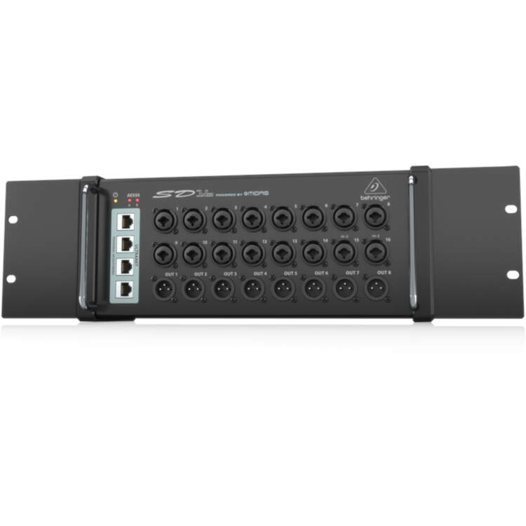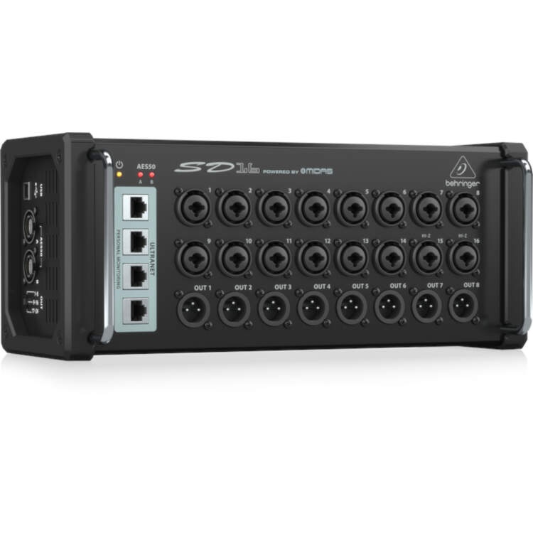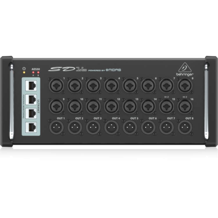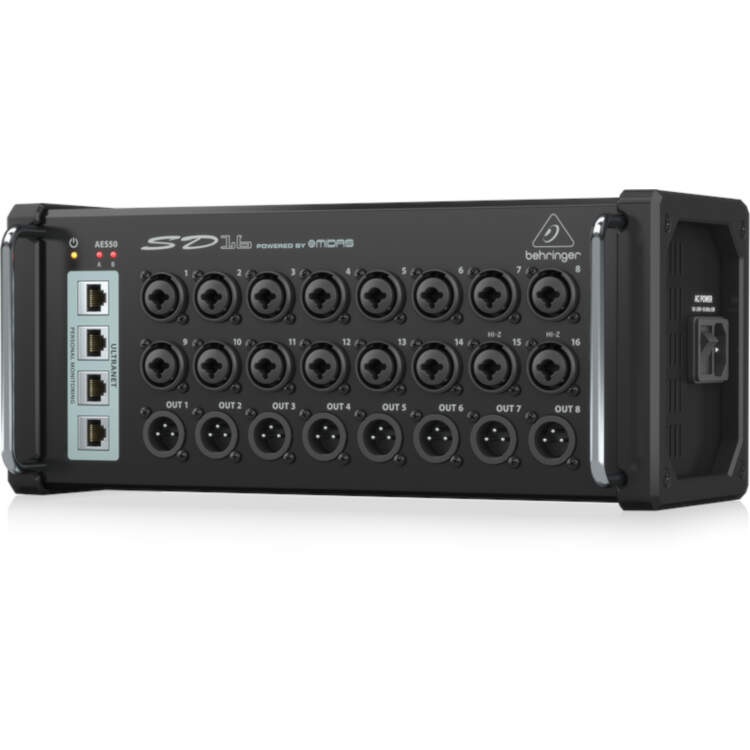 Digital mixing has revolutionized virtually everything in the live- entertainment production workflow. Now we’ve come up with the perfect solution for connecting the onstage talent with your Front of House (FOH) console, and the rest of the world – the ultra-cool and ultra- affordable SD16 Stage Box! The SD16 provides 16 MIDAS-designed remote- controllable mic preamps, 8 balanced analog XLR returns at the stage end, plus an integrated 4-port ULTRANET distribution hub for direct connection to our P16-M personal monitor mixers – without any additional hardware required. Plus, the SD16 is extremely compact and comes with rugged protective bumpers, so you can toss them directly on stage wherever you need them. The best part – all it takes is a single shielded CAT5e cable per stage box (up to 330 ft / 100 m length). And If you need more inputs, or just want to keep your cable runs short and tidy, putting an SD16 at stage front and another behind the drum riser gives you an additional 16 inputs for drum and guitar/bass amp mic’ing. When used as part of a complete X32 system, as many as three SD16 Stage Boxes can be cascaded via the built-in AES50 ports to provide up to 48 bidirectional inputs and 24 balanced XLR outputs. An onboard ULTRANET distribution hub provides power and 16 channels of audio to 4 BEHRINGER POWERPLAY P16-M personal monitor mixers per SD16, all via inexpensive shielded CAT5e cabling – and without any additional hardware. Two of the programmable inputs are also compatible with Hi-Z sources, so you can connect keyboards, acoustic and bass guitars, etc., with no DI box required. The SD16 also features a USB port for fast and easy system updates via your PC.