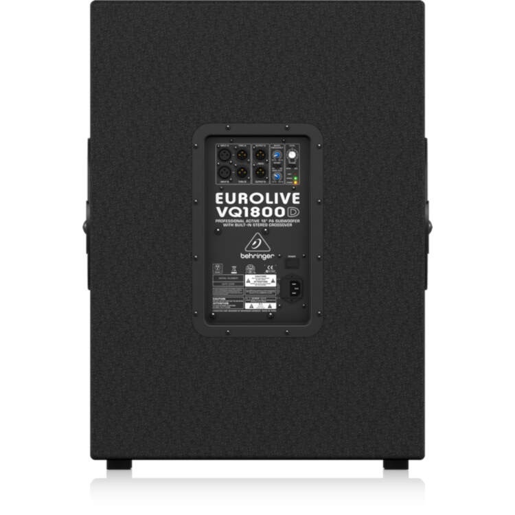 The VQ1800D PA subwoofer stands head and shoulders above the rest of the pack and delivers exceptional performance, even when pushed to the limit. Lightweight and powerful with custom-designed transducers, 500 Watts of Class-D output power and a state-of-the-art onboard active stereo crossover, the VQ1800D is ideal for any music application – at a price that is unheard of in this class.Experience the EUROLIVE VQ1800D at your local dealer today and find out why more and more professionals are turning to BEHRINGER EUROLIVE active subwoofers for their superb performance and extraordinary value.
