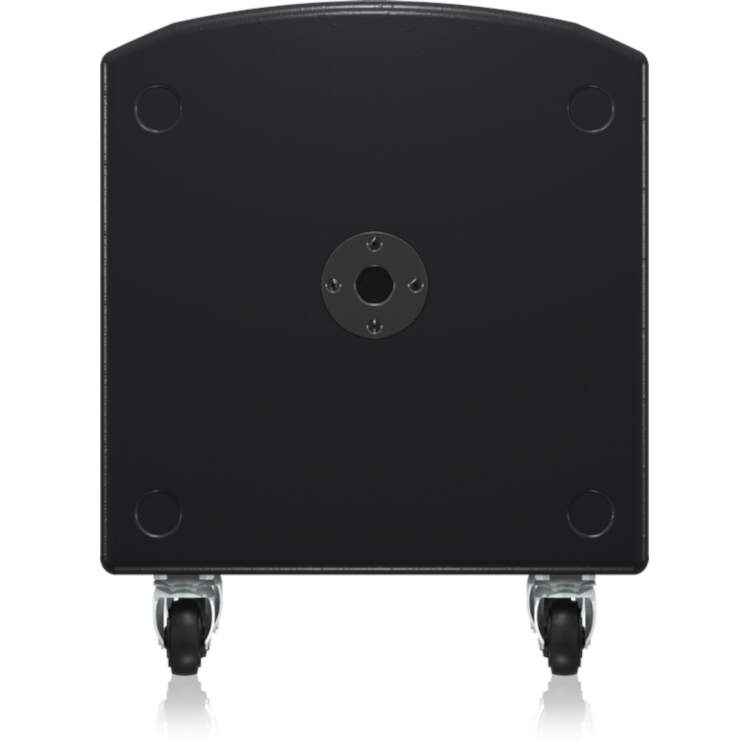 The birch plywood enclosure is fi nished in a hard wearing semi matt black paint and fi tted with a rugged powder coated perforated steel mesh grille, 35 mm pole mount to support a satellite speaker, and plated steel castors with rubber tyres. Mains power input and link output is provided via Neutrik powerCON connectors.