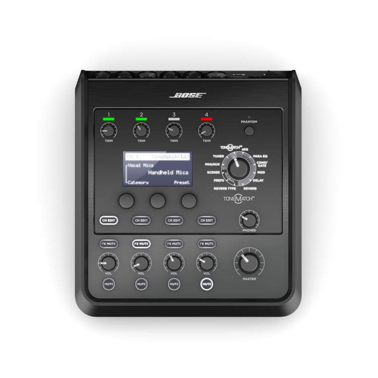 Take control of your music with the T4S ToneMatch mixer, an ultra-compact 4-channel interface designed for performers. Engineered with a powerful DSP engine and intuitive user control, the T4S offers studio-quality EQ, dynamics and effects. Sound great with integrated Bose ToneMatch processing and zEQ, especially when connected to a Bose L1 or F1 system for full end-to-end tonal control. Play confidently on stage with the rugged T4S using its tactile controls, easy-to-read LED display and scene recall. The T4S, a true performer’s companion.