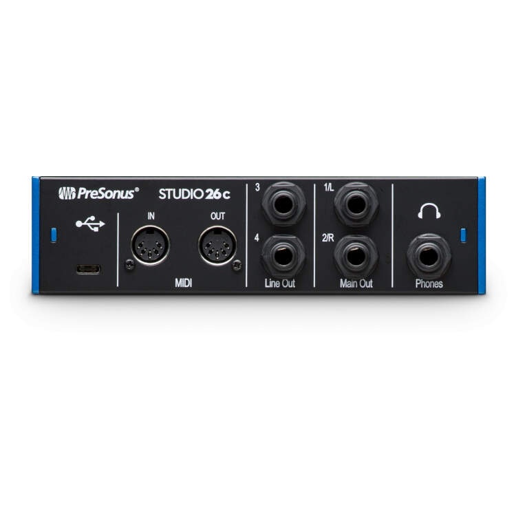 The Studio 26c has four balanced 1/4" line outputs; the first two are fed by a dedicated level control for use with a pair of active monitors. A 1/4" TRS stereo headphone output with a front-panel volume knob accommodates a set of headphones. 5-pin MIDI I/O jacks on the rear panel allow simple hookup of a MIDI controller, synthesizer, or sound module.