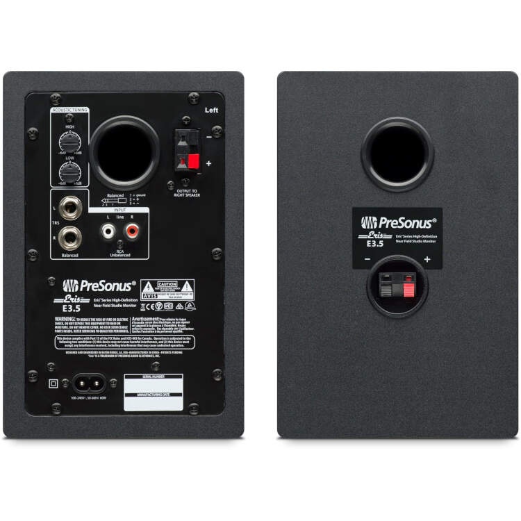 The PreSonus Eris E3.5 is a pair of 3.5" 2-way 25W nearfield monitors designed to provide a compact sonic reference system for musicians, producers, and audio engineers in home setups, project studios, and commercial facilities. Each monitor produces a frequency response of 80 Hz to 20 kHz via a 3.5" Kevlar woofer and a 1" silk dome tweeter powered by a 25W class AB amplifier. The monitors can handle 100 dB maximum peak SPL. A rear bass-reflex port provides enhanced low-frequency range.