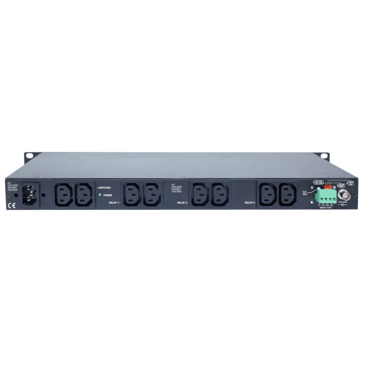 Six sequenced rear panel outlets (in 3 groups), two switched rear panel outlets, and one front panel switched outlet