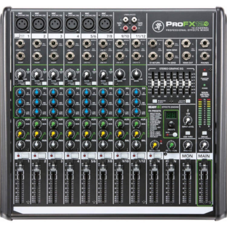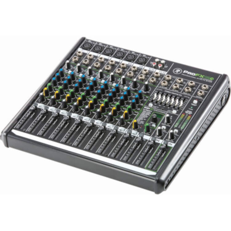 The ProFX12v2 12-channel mixing console from Mackie features a built-in effects engine, and is ideal for a plethora of live sound reinforcement applications ranging from live bands and DJs to lecturers and presenters. With 6 XLR mic inputs with low-noise Vita microphone preamps, per channel 3-band EQ, 1 aux send, and an FX out for feeding external processors, the ProFX12v2 offers professional features to suit a wide variety of configurations.