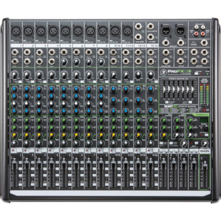 The ProFX16v2 16-channel mixing console from Mackie features a built-in effects engine, and is ideal for a plethora of live sound reinforcement applications ranging from live bands and DJs to lecturers and presenters. With 10 XLR mic inputs with low-noise Vita microphone preamps, per channel 3-band EQ, 2 aux sends, and an FX out for feeding external processors, the ProFX16v2 offers professional features to suit a wide variety of configurations.