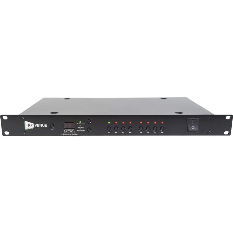 The RF Venue 4 Zone is an antenna combiner for wireless microphones receivers, which combines up to four separate pairs of diversity antenna connections. Designed to take the complexity out of multi-zone signal management, it is ideal for use in multi-purpose rooms, indoor-outdoor configurations or main stages with secondary breakout rooms.
