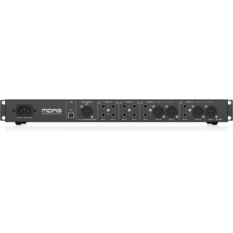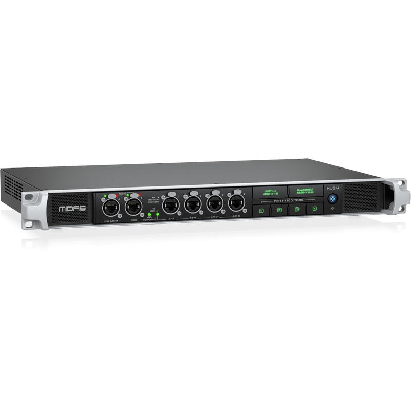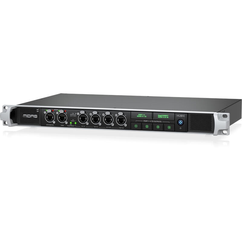 Midas HUB4 is the multi-tool in your stage rack providing analogue and digital outputs for various applications. HUB4 can supply up to four DP48 personal monitor mixers with PoE (Power over Ethernet) and 48 channels of 24-bit / 48 kHz audio. HUB4 also collects 48 channels of upstream audio and forwards this audio to the FOH console, either from stage boxes connected to the AES50-B (THRU) Port or 8 return channels from each of Ports 1-4.Cascading Hubs for Large Setups