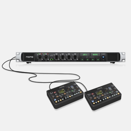 HUB4 can convey control messages from M32 FOH consoles to DP48 personal mixers, as well as remote control messages between DP48 units.Midas DP48 Personal Monitor Mixers support remote control of other DP48 units and can also receive control information from M32 mixing consoles. This M32 control information includes assignments, names and colors of channels, which are transmitted via AES50 for easy configuration of personal mixers. HUB4 can convey control messages from the FOH console to personal mixers as well as between personal mixers. This control message system works when DP48 units are connected to Ports 1-4 or to the ports on daisy-chained hubs.
