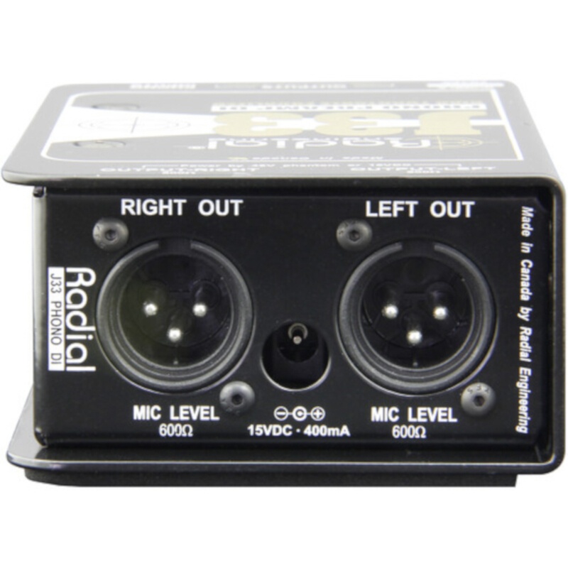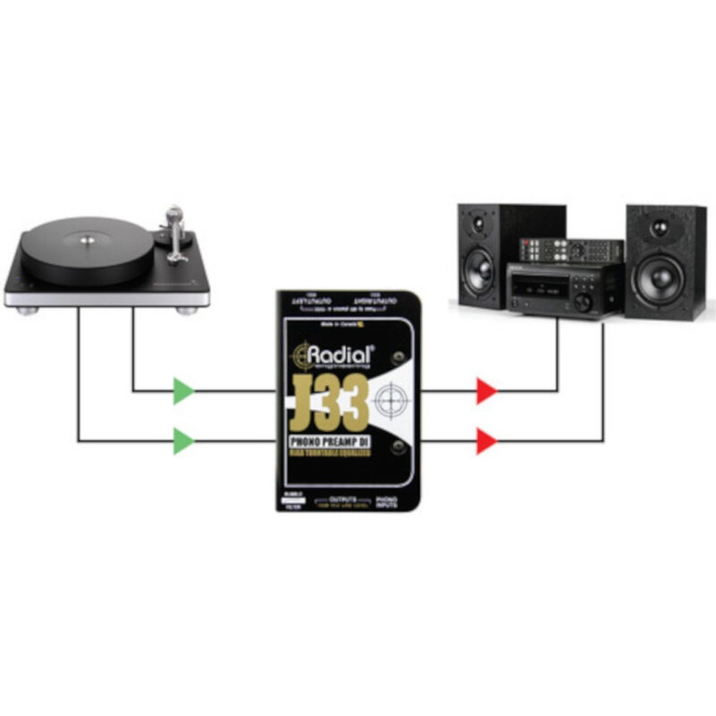 The J33 from Radial is designed specifically for use with turntables and is a combination RIAA turntable preamp and active direct box. This allows vinyl albums (LP's) to be connected directly to a microphone preamp in a mixing console. The unit is ideally suited for archiving, sampling, scratch performances and DJ mixing when the highest possible sound quality is required.