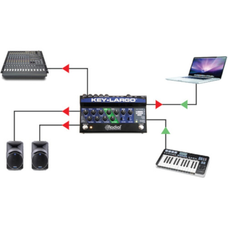 Mix three keyboards together with the output of a laptop soft-synth, which makes the Key-Largo the center of your performance setup. Connect a 1/4" cable to the footswitch input on your main keyboard to utilize the Key-Largo as a sustain pedal.Radial Engineering Key-Largo Specifications: