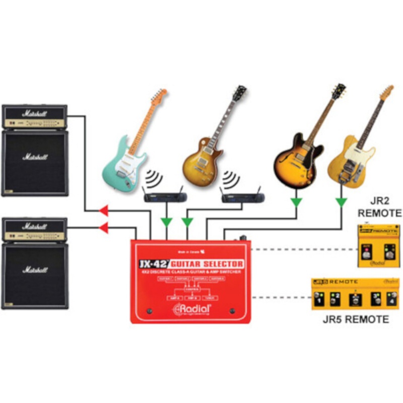The JX42 from Radial is a compact guitar and amp switcher made to handle up to four guitars and two amps simultaneously. Designed for concert touring, the JX42 is equipped with four radio-style switches that immediately turn the previous channel off when the new channel is selected. These are complemented with LEDs for visual feedback on dark stages. To ensure quiet switching, opto-resistive couplers are employed to eliminate popping that may otherwise occur.
