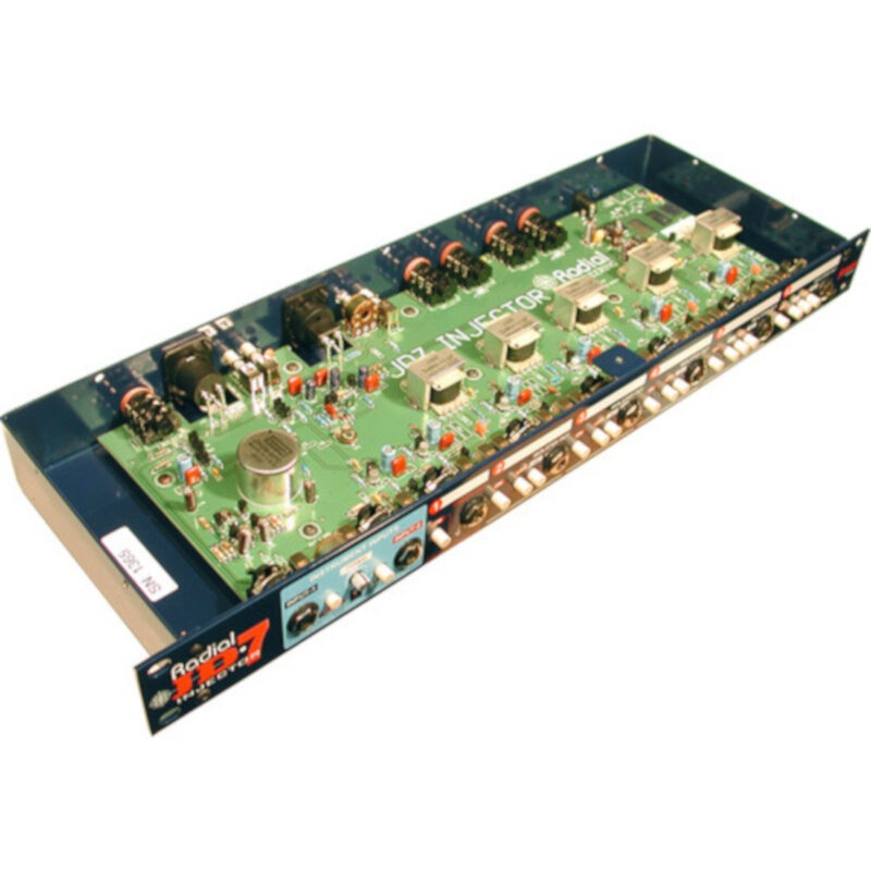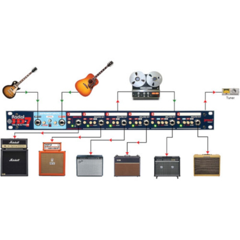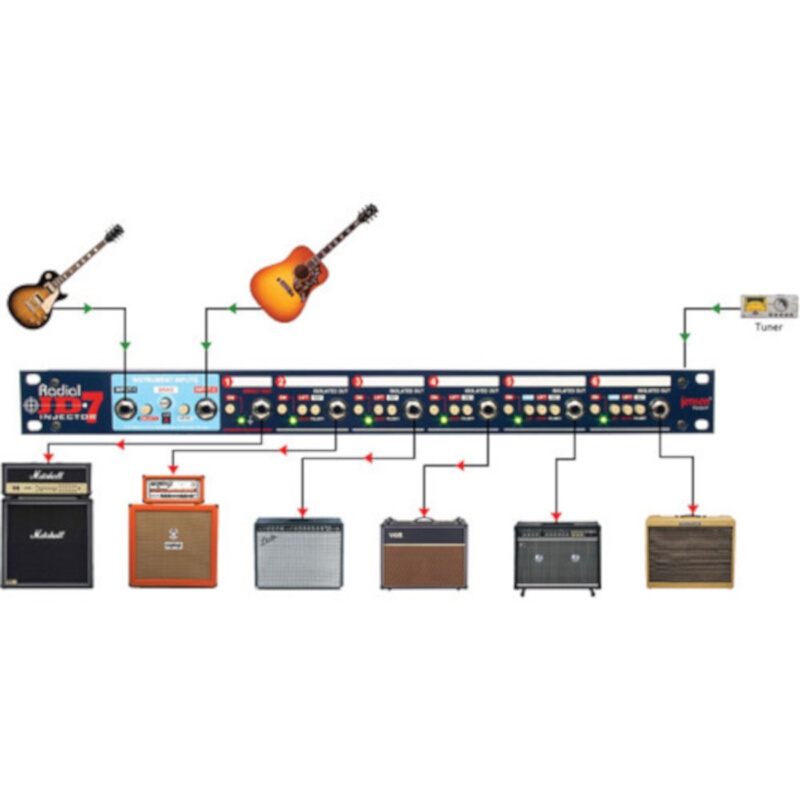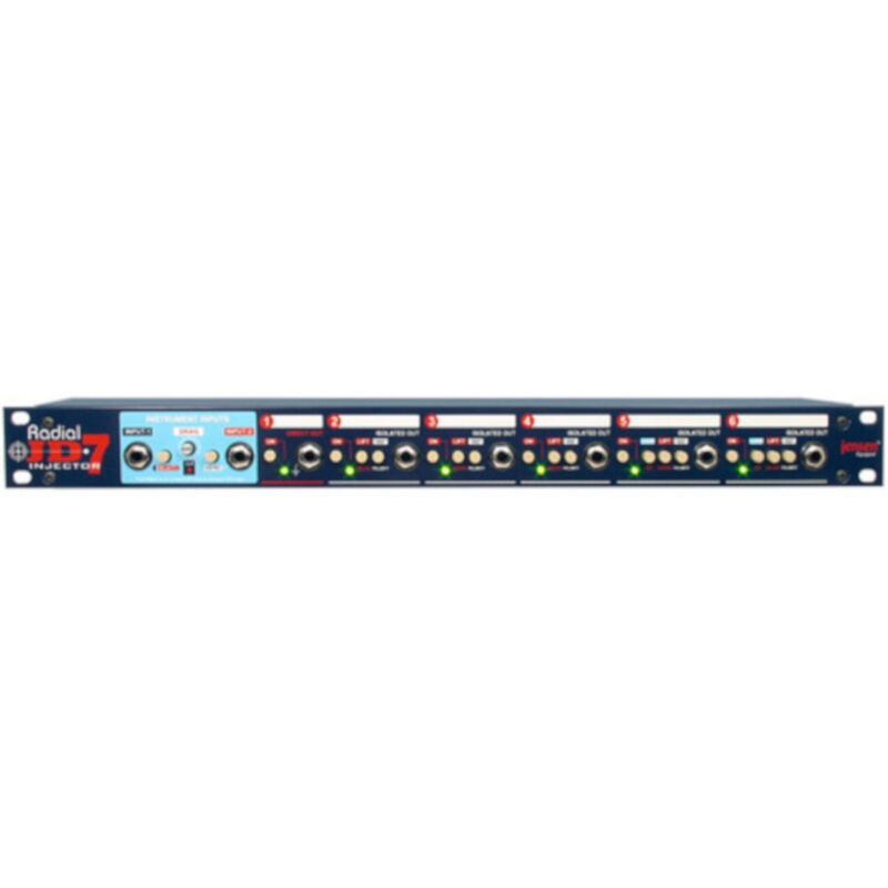 The JD-7 Injector from Radial Engineering is not just a guitar distribution amplifier. It is a creative recording tool designed for driving up to seven amplifiers simultaneously from a single guitar signal. Front-panel connectors and controls make it easy to select amplifiers, ground paths, and polarity. The JD-7 produces extremely accurate sound thanks to a Class-A audio path that is 100% discreet and optimized for electric guitar signals.