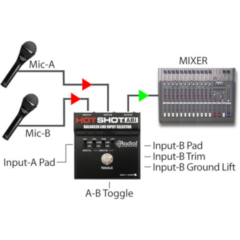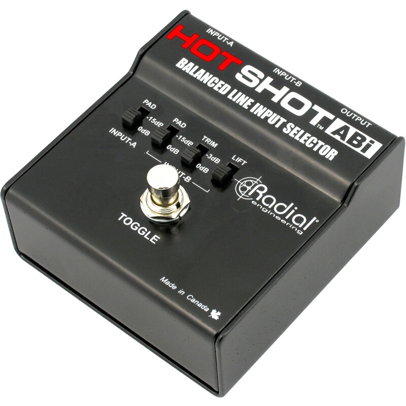 The Radial Engineering ABi Line Input Selector is a highly useful input switch for recording or stage use. Built to take abuse with a chassis made of 14-gauge steel, the Hotshot ABi has a number of applications. You can use it to switch between two microphones on stage, between two audio sources to feed into a mixer, between two instruments, or as a simple cough-mute switch.