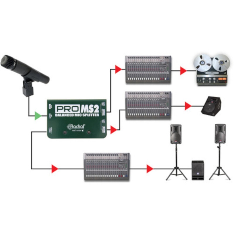 Allowing you to send a single microphone or DI signal to up to 3 separate destinations, the ProMS2 Passive Microphone Splitter from Radial Engineering can be used in the studio to send a mic to multiple preamps for auditioning and live to send one source to multiple mixers or to supply a broadcast feed. It is a passive device, therefore requiring no power for operation. The Eclipse ET-MS10 transformer is designed to provide a flat frequency response while its RF filtering helps keep your signal interference free. The device features 14-gauge steel construction to stand up to live use.