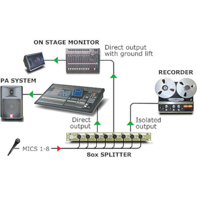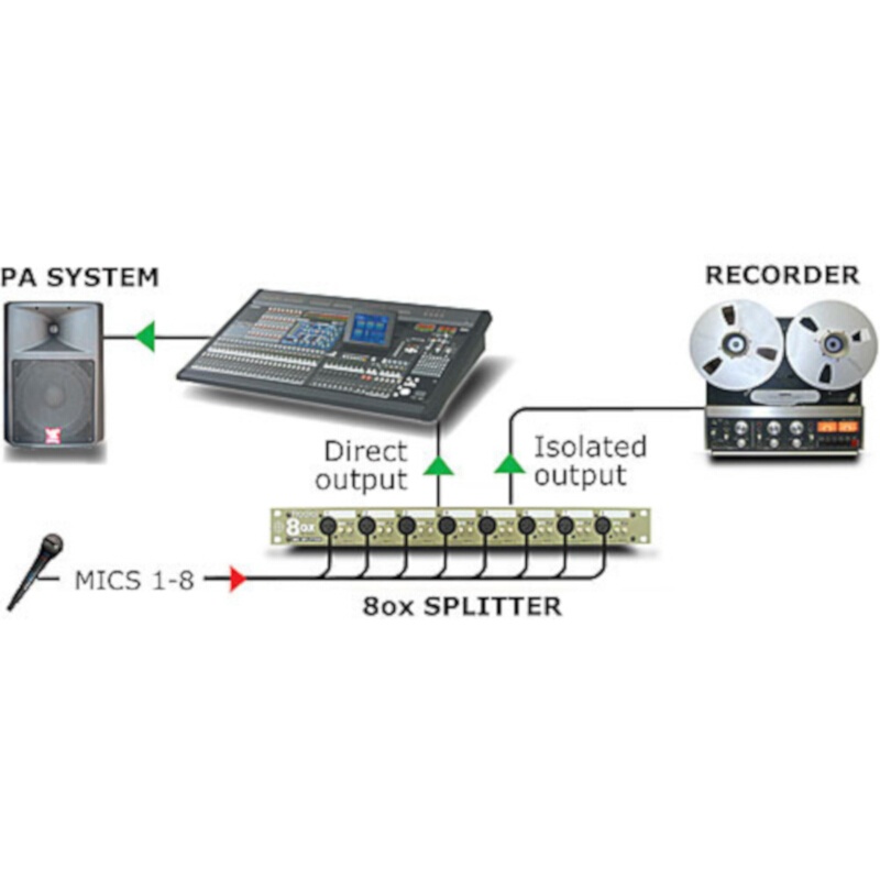 The 8ox-rm-r from Radial Engineering is a rack-mountable eight-channel, three-way mic splitter. It splits up to eight microphone signals into three outputs, allowing you to feed three mic preamps from a single source. The 8ox-rm-r also has a pad on each channel for line-level sources. This makes the unit very flexible for all types of signal splitting, but particularly for live recording because it will deliver transformer-isolated audio to the recording engineer and a direct feed to the front of house and monitor consoles.