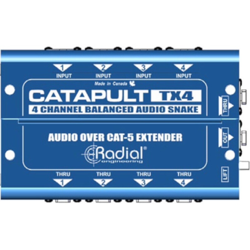 The Radial Engineering Catapult TX4 is a four-channel snake which allows you to route four XLR connections across long distances using Cat 5 or Cat 6 cable, doing so with little to no signal degradation. As such, it's useful in live-sound reinforcement applications, as it allows live sound stage techs to use relatively affordable cable to secure quality audio connections around large stages and venues. It's also suitable for system contractors, who can now utilize pre-wired networks to move audio throughout disparate rooms.