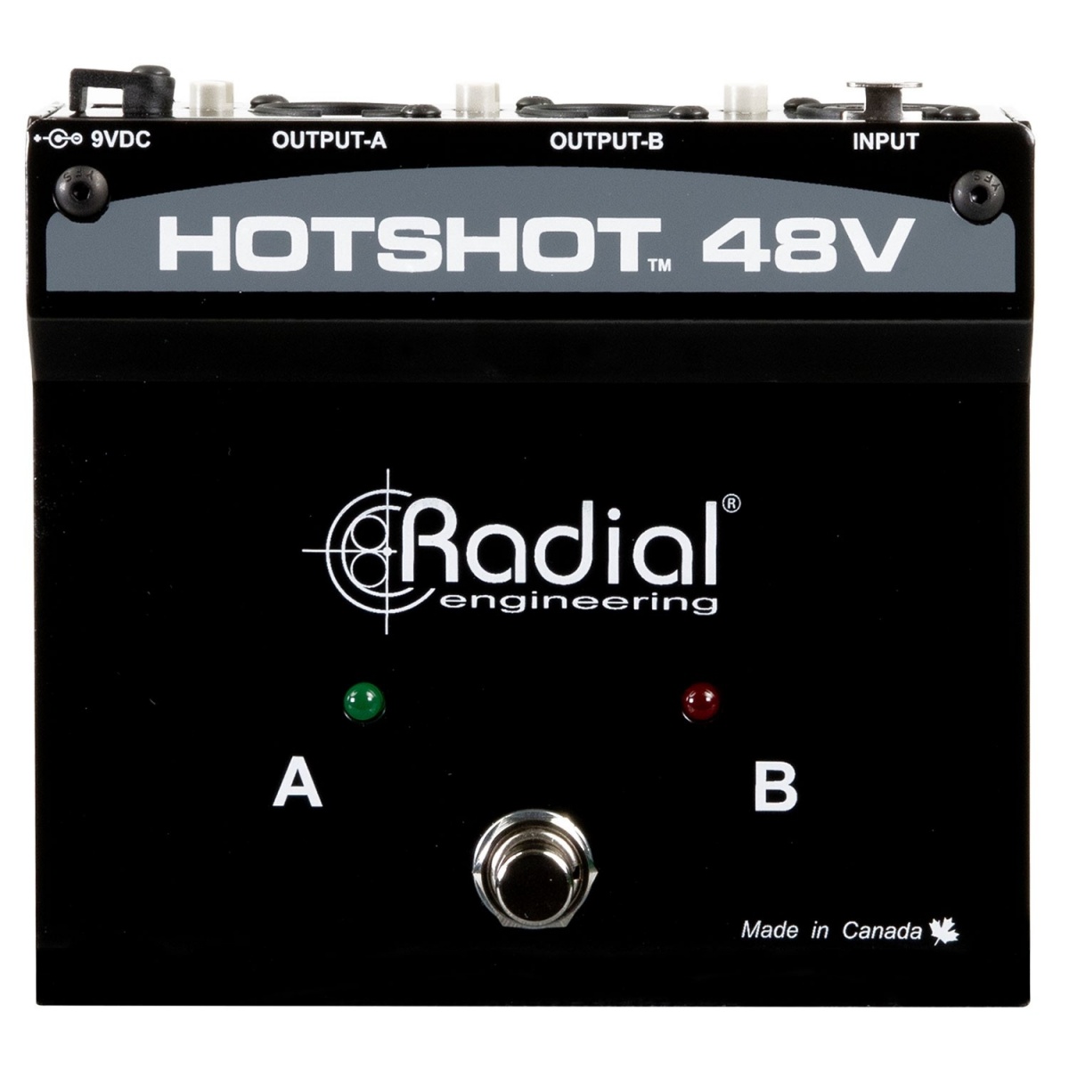 LED indicators display the active output, and the footswitch itself can be configured for latching or momentary action. While the HotShot 48V is specifically designed to address issues when switching condenser microphone outputs, it works equally well with dynamic mics also.