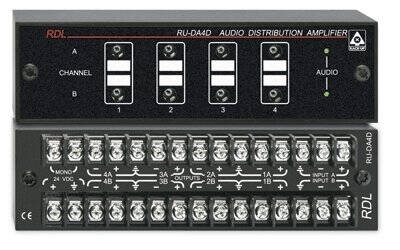 The RU‑DA4D is the ideal choice in most applications where line‑level signals need to be distributed. Each of two line‑level inputs permit the connection of either balanced or unbalanced, high or low impedance audio lines. Both may be connected to a single line source to provide up to eight distributed mono signals.