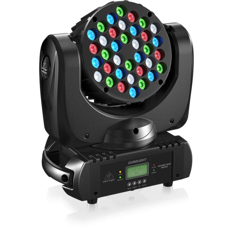 The EUROLIGHT MOVING HEAD MH363 is a professional 36 x 3-Watt RGBW LEDs moving head Ideal for stages, in the club, at exhibitions, in TV studios and in many other areas. The MH360 RGBW ultra-narrow beam sweeps over the stage like a light blade. All features can be adjusted by the 4 buttons control panel with LCD display and you can choose between 3 different modes of operation: DMX 512, sound control or master/slave mode. Universal DMX-compatible systems – It comes equipped with hanging brackets at a price bound to light up the eyes of even the most budget-conscious stage manager!