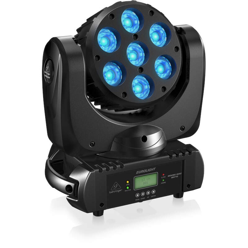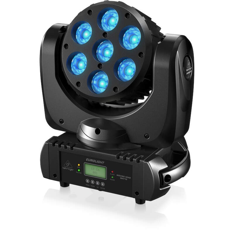The EUROLIGHT MOVING HEAD MH710 is a professional 7 x 10-Watt RGBW 4-in-1 LED moving head light ideal for stages, in the club, at exhibitions, in TV studios and in many other areas, the MH710 real RGBW mixing system under the lens ensures perfect colours. All features can be adjusted by the 4 buttons control panel with LCD display and you choose between 3 different modes of operation: DMX 512, sound control or master/slave mode. Universal DMX-compatible systems – It comes equipped with hanging brackets at a price bound to light up the eyes of even the most budget-conscious stage manager!