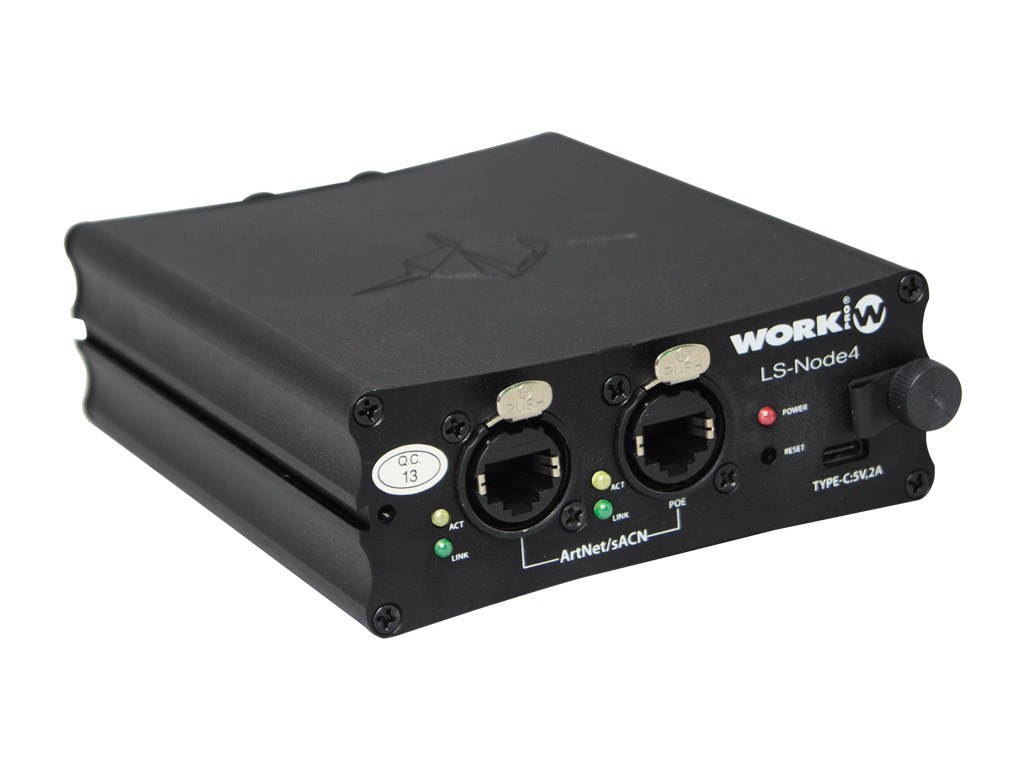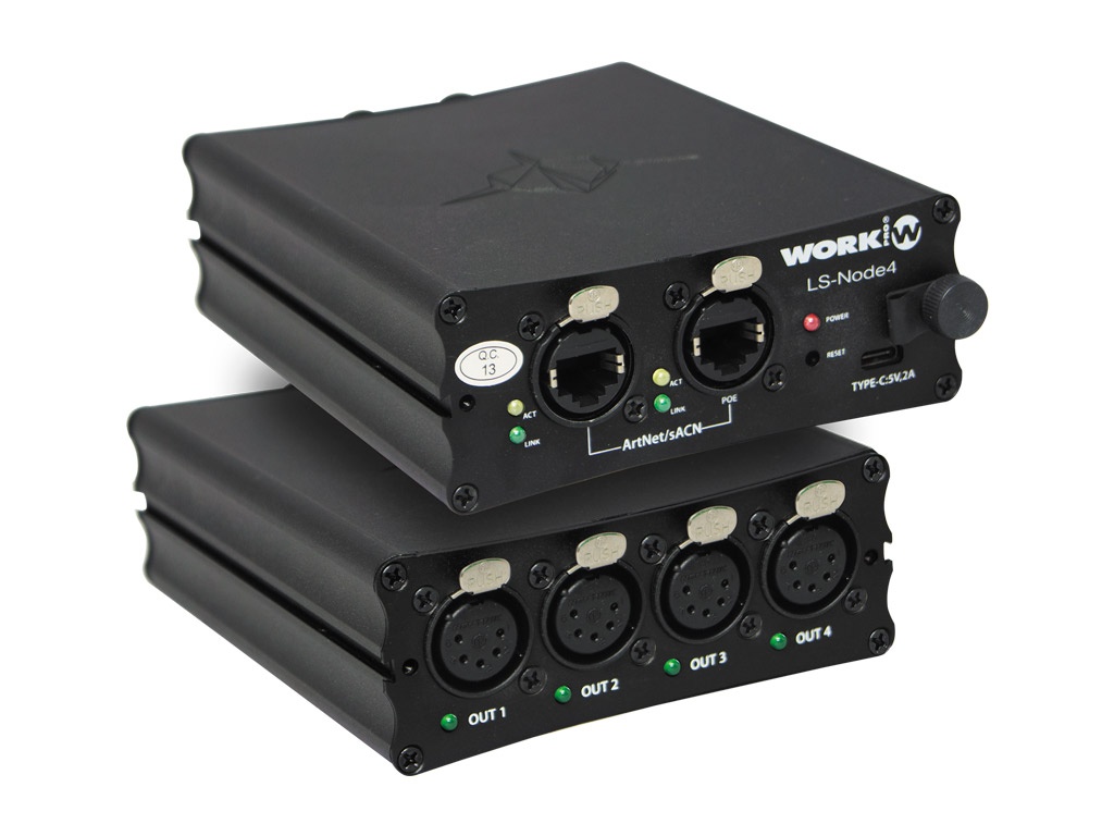 The LS-Node series is the new RDM/DMX streaming range from WORK PRO that supports industry standards ArtNet & sACN. They feature from 1 up to 4 DMX universes, with 3 different models: LS-Node1, LS-Node2 & LS-Node4, each of which adds its respective number of freely configurable DMX universes.