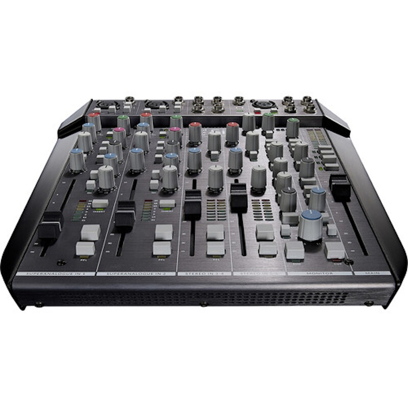 It features two mono input channels—each containing a console-grade SuperAnalogue microphone preamp with phantom power, a high-pass filter, and up to 72 dB of gain, plus a line / Hi-Z 1/4" input—and two stereo input channels. The mono channels boast single-knob compressors, 2-band EQ, and balanced insert points for flexible onboard and outboard processing, and all channels are outfitted with smooth 100mm faders.