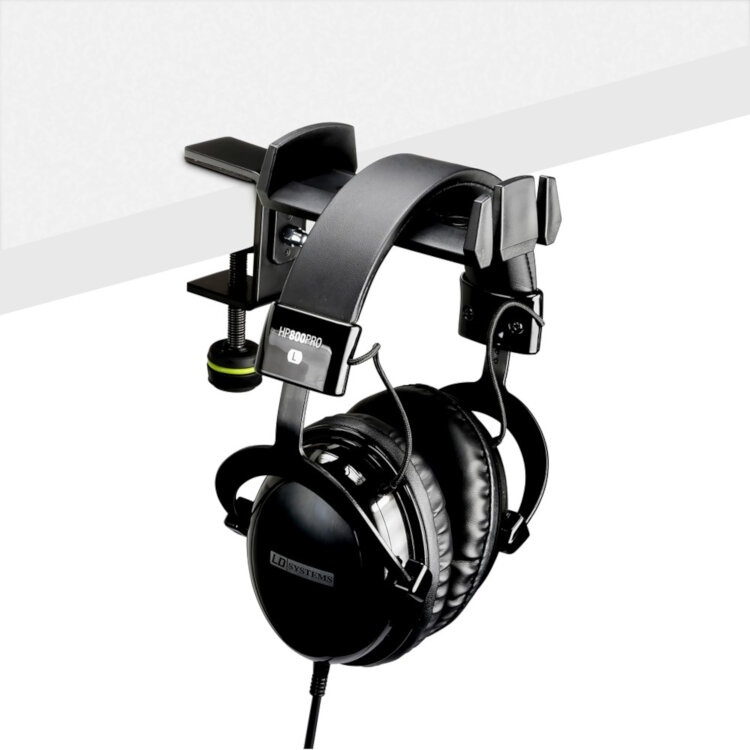 This hanger clamps to any desk with 5 to 45 mm thickness to put your headphones in easy reach. It features two convenient slots to keep your headphone cables neat and tidy, and the plastic set screw tip protects your desk's finish.