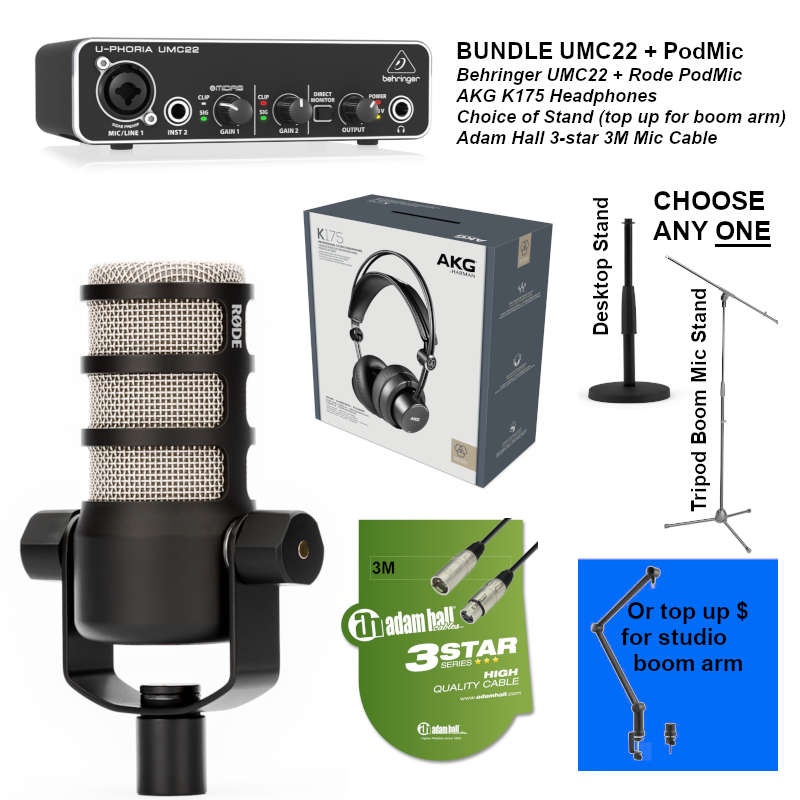 We have curated a fantastic bundle for you, combining the new and very popular Rode PodMic with the Behringer UMC22 interface along with the highly-rated AKG K175 Studio headphones, 3M mic cable and choice of either a desktop mic stand, tripod mic stand(choose one only). Or if you prefer a microphone boom arm, just select the option to top up a small amount of money more for one