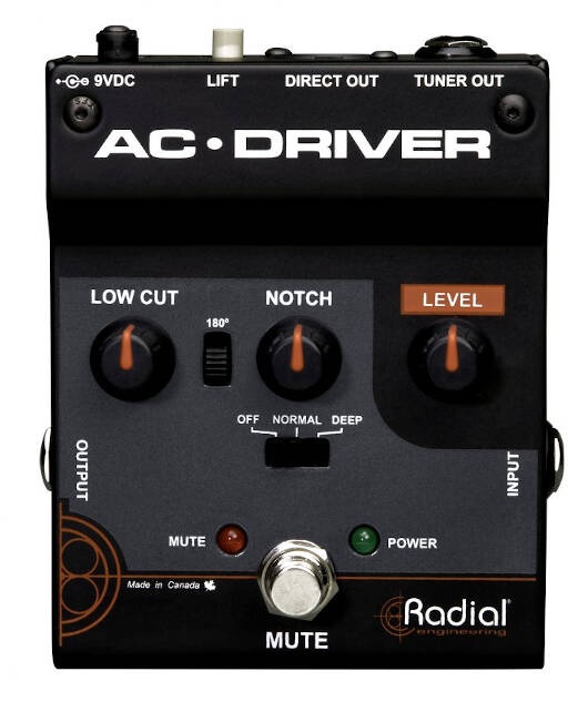 The AC-Driver is a studio-quality preamp built into a pedal format for acoustic instruments, designed to provide you with incredible sound along with the ability to control your levels and eliminate feedback on stage. Unlike a typical DI, you can connect the output of the AC-Driver directly to a powered speaker and control the level from on stage, making it ideal for solo performances where you may not have the luxury of a sound engineer. Additionally, you can use the notch and 180° controls to help eliminate feedback that can be all too common with amplified acoustic instruments, and a mute footswitch gives you the ability to silently tune on stage or switch between instruments without noise.