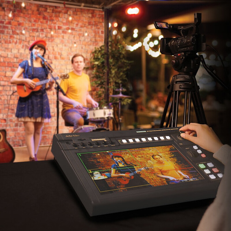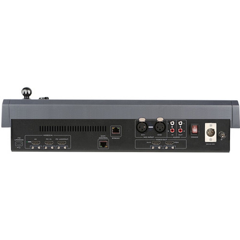The switcher combines touchscreen functionality with traditional switcher tools such as backlit push buttons, a joystick, and a zoom scroll wheel to provide an all-in-one switching device. It features 3-pin XLR and RCA inputs for analog audio input. The built-in encoder supports H.264, enabling you to stream to any CDN-compatible site, and the switcher is compatible with optional OBS live streaming software. You can power the switcher using the included AC to DC power adapter, or via 12 VDC batteries via the 4-pin XLR power port.
