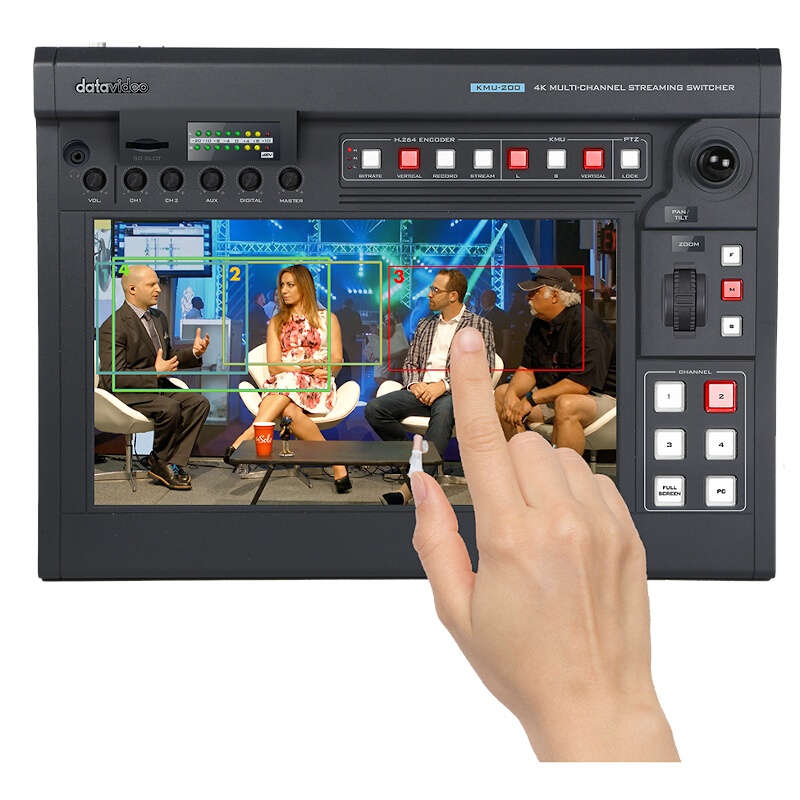 The Datavideo 4K Multicamera Touchscreen Switcher with Streaming and Recording is a touchscreen streaming switcher that can simultaneously record to an SD card. It supports programming in 16:9 or 9:16, so you can stream for traditional viewing, or for portrait mode viewing. It features one each UHD 4K and HD HDMI input. The switcher allows you to select regions of interest from the 4K video, essentially cutting four shots out of the UHD video, to use as your four inputs to switch between.
