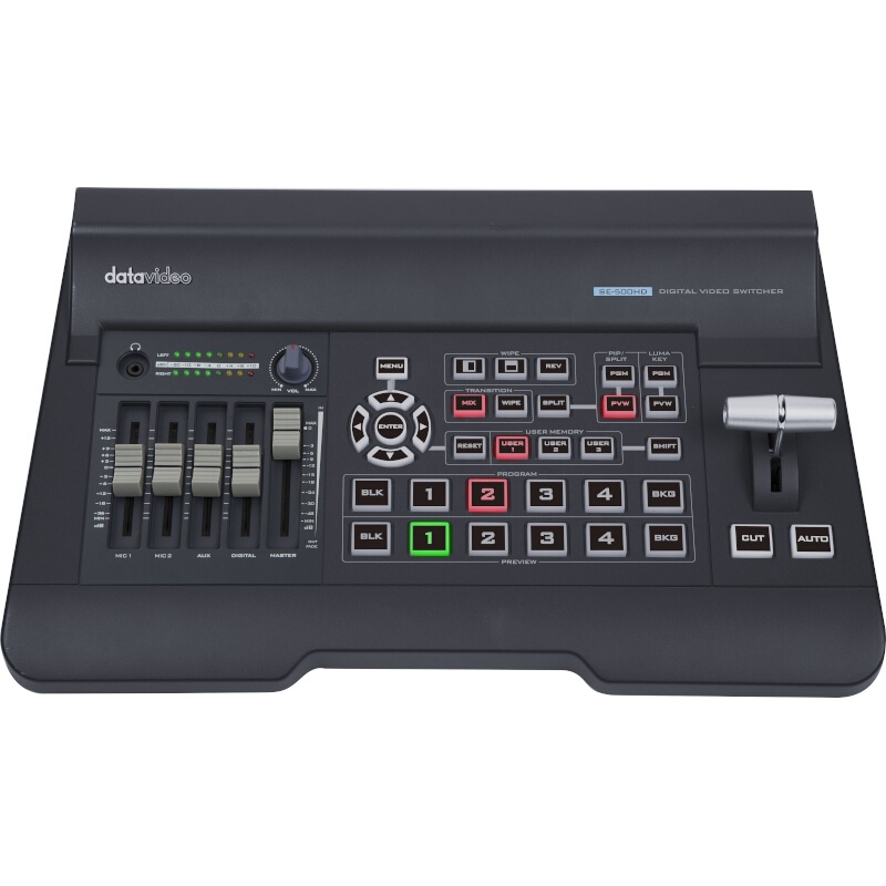 DataVideo SE-500HD is a small, cost-effective, 1080p HDMI video switcher with easy-to-use professional features. It has four HDMI inputs and two HDMI outputs, which allow users to connect consumer camcorders, GoPros, HDMI laptops or tablets. What makes the SE-500HD special is the ability to accept various input resolutions at once, so users no longer need to add converters into the workflow.