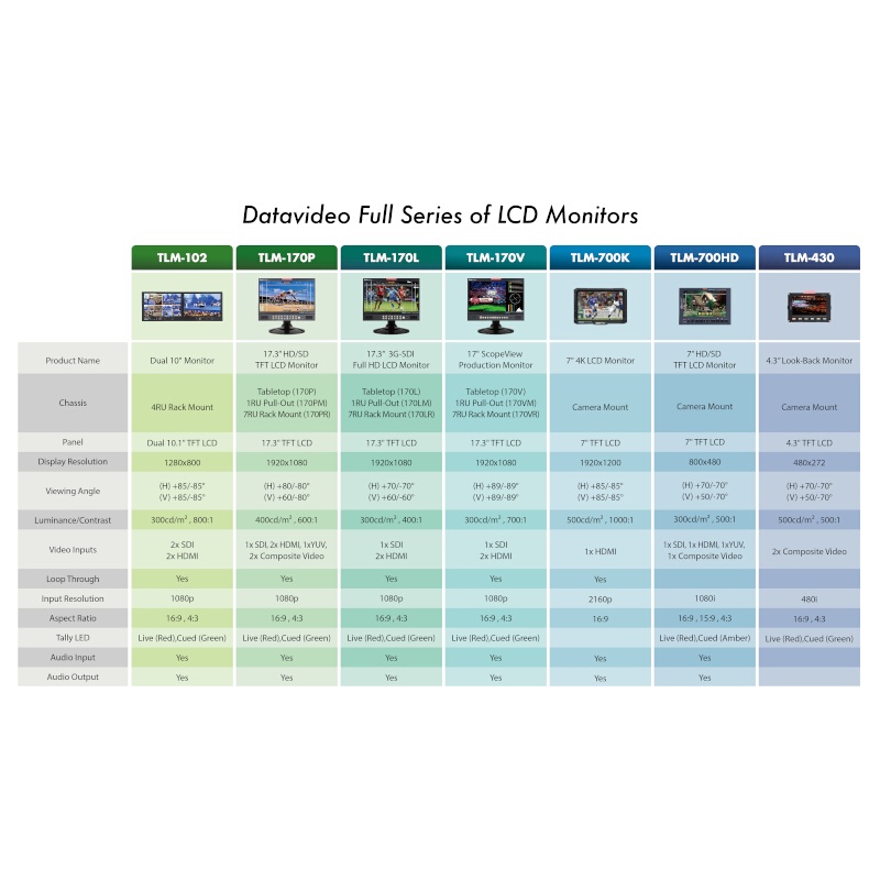The 17.3" 3G-SDI Full HD Rackmount LCD Monitor from Datavideo is suitable for applications in a live production gallery, 19" rack monitoring, OB Van, or a video editing suite. It comes with a 3G-SDI video input with loop-through output and two HDMI inputs. The monitor supports embedded audio on SDI and HDMI (version 1.3).