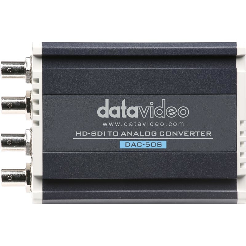 The DAC-50S from Datavideo is an HD/SD-SDI to Analog converter with the ability to scale both up and down. The converter has low power consumption and low heat dissipation. It supports a wide range of 3G video formats, including 1080p 50/59.94/60Hz (DAC-8P/9P/60/70), and supports YUV and RGB color space (DAC-8P/9P/60/70). The DAC-50 is housed in a rugged metal frame, and can be rack-mounted using the optional RMK-2 2RU rack mount kit. This unit provides an SDI cable drive and features reclocking and video equalization.